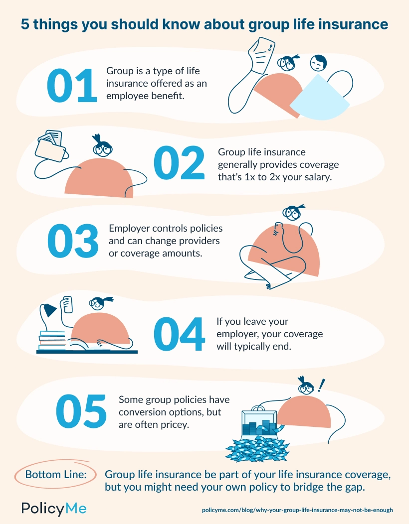 Group life insurance is a one-size-fits-all product that is negotiated and provided by your employer. This doesn’t mean group life insurance is bad—after all, it provides you with some protection for low or no cost. But group coverage is not usually sufficient for most people.