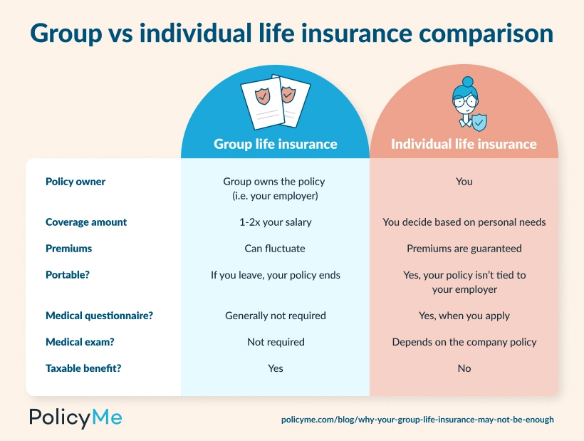 In contrast, individual life insurance is customizable and based on your financial situation and needs. You decide how much coverage you want and manage the policy yourself.